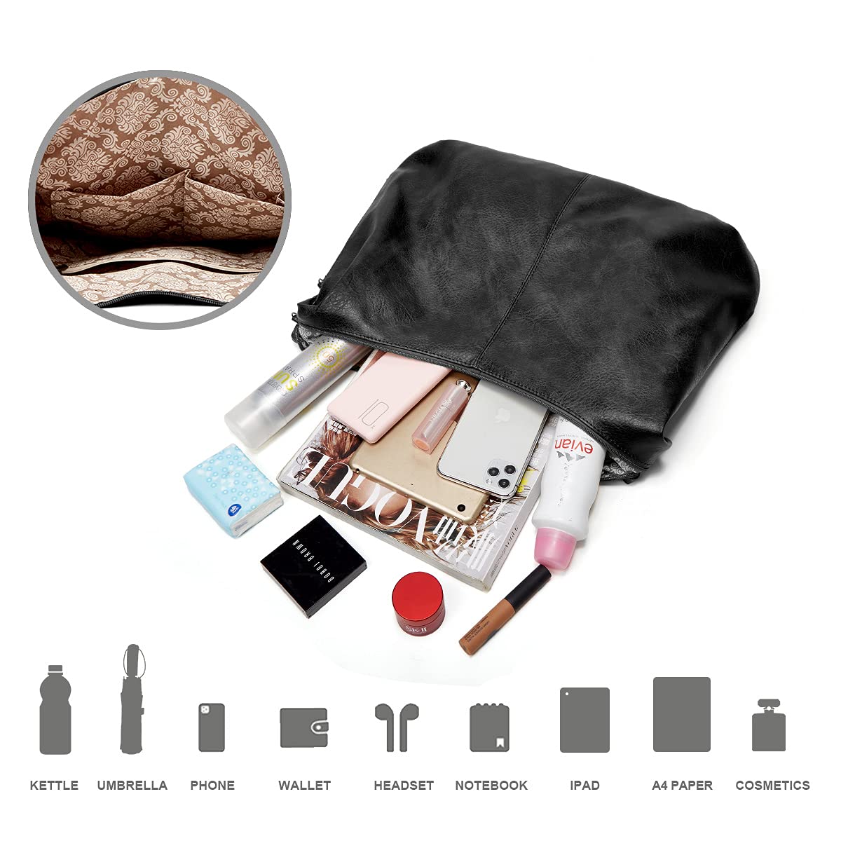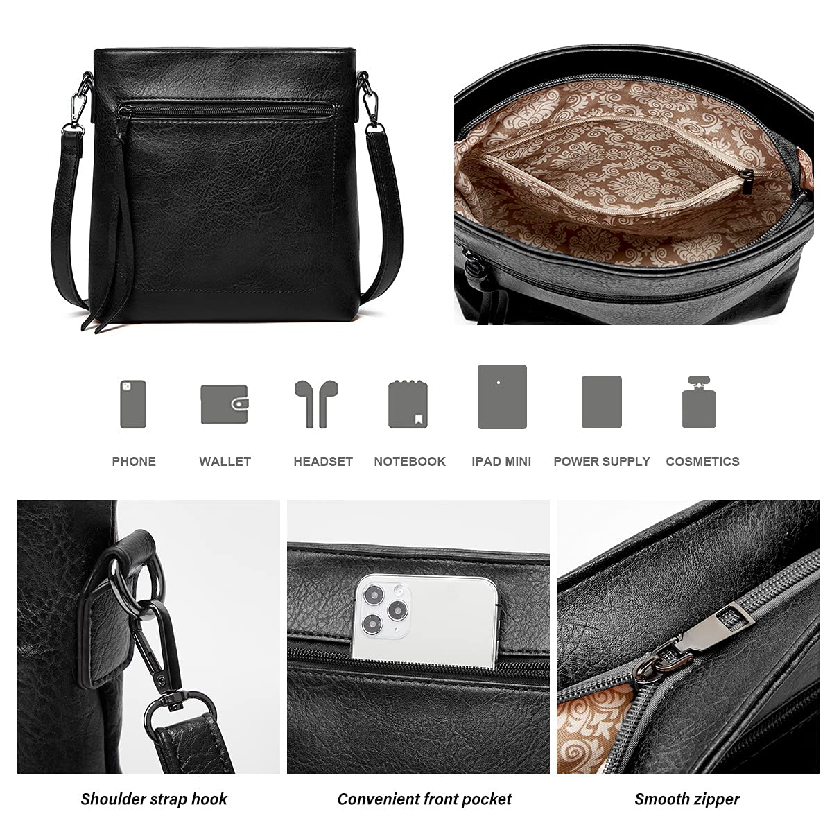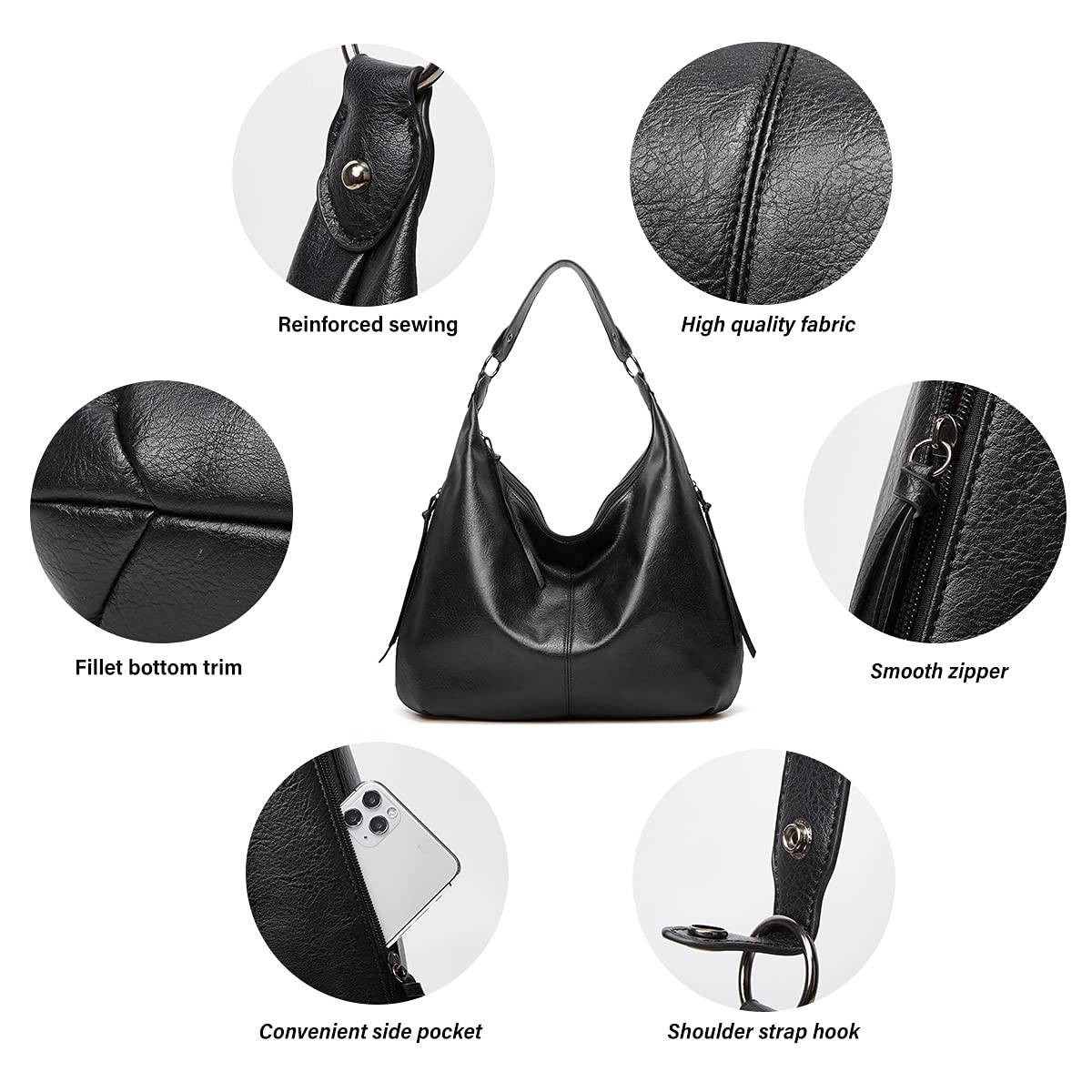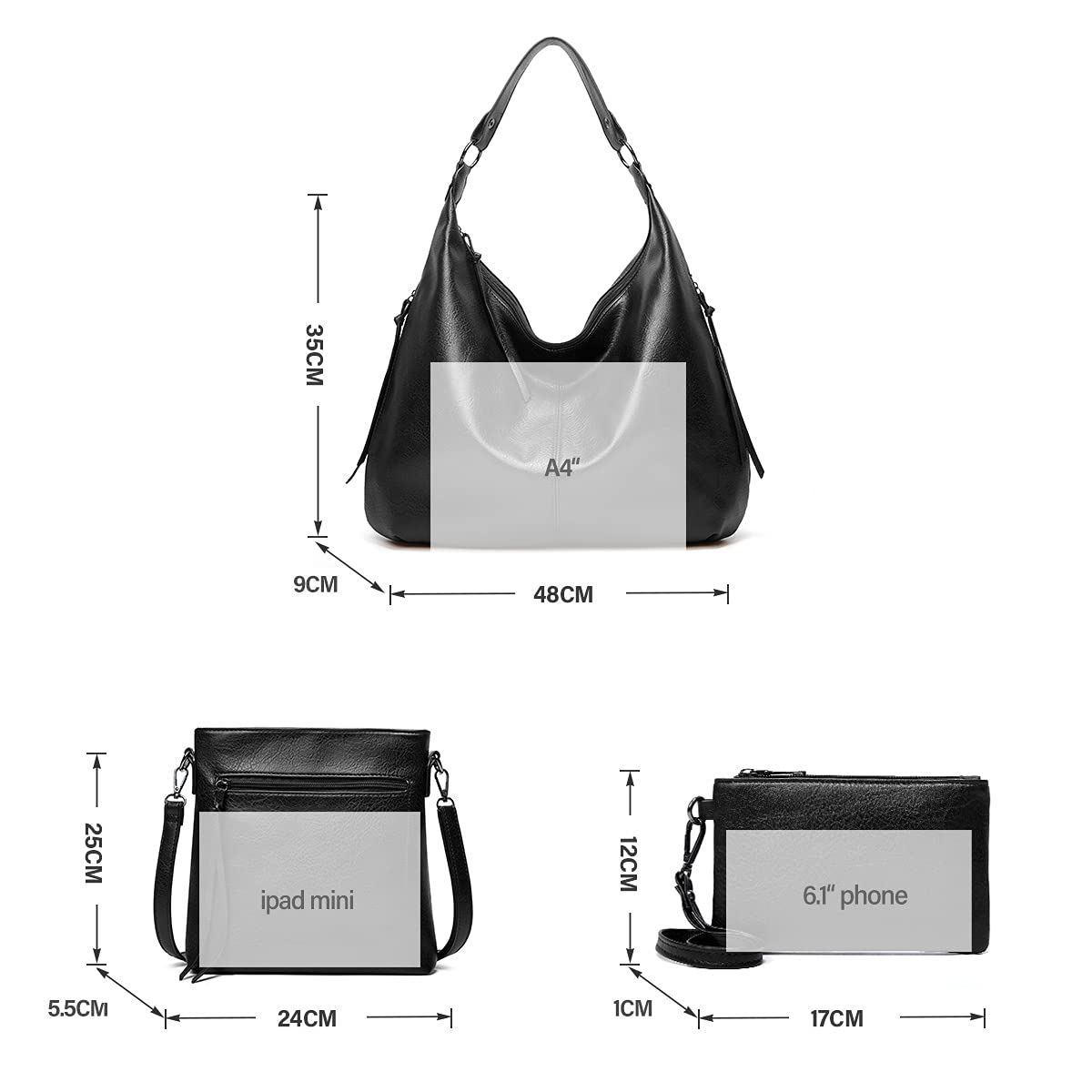 Méret: Hobo táska: 48 x 35 x 9 CM; Crossbody táska: 24 x 25 x 5.5 CM; Pénztárca: 17 x 12 x 1 hüvelyk. A kereszttartó pánt maximális állítható hossza 103 cm.