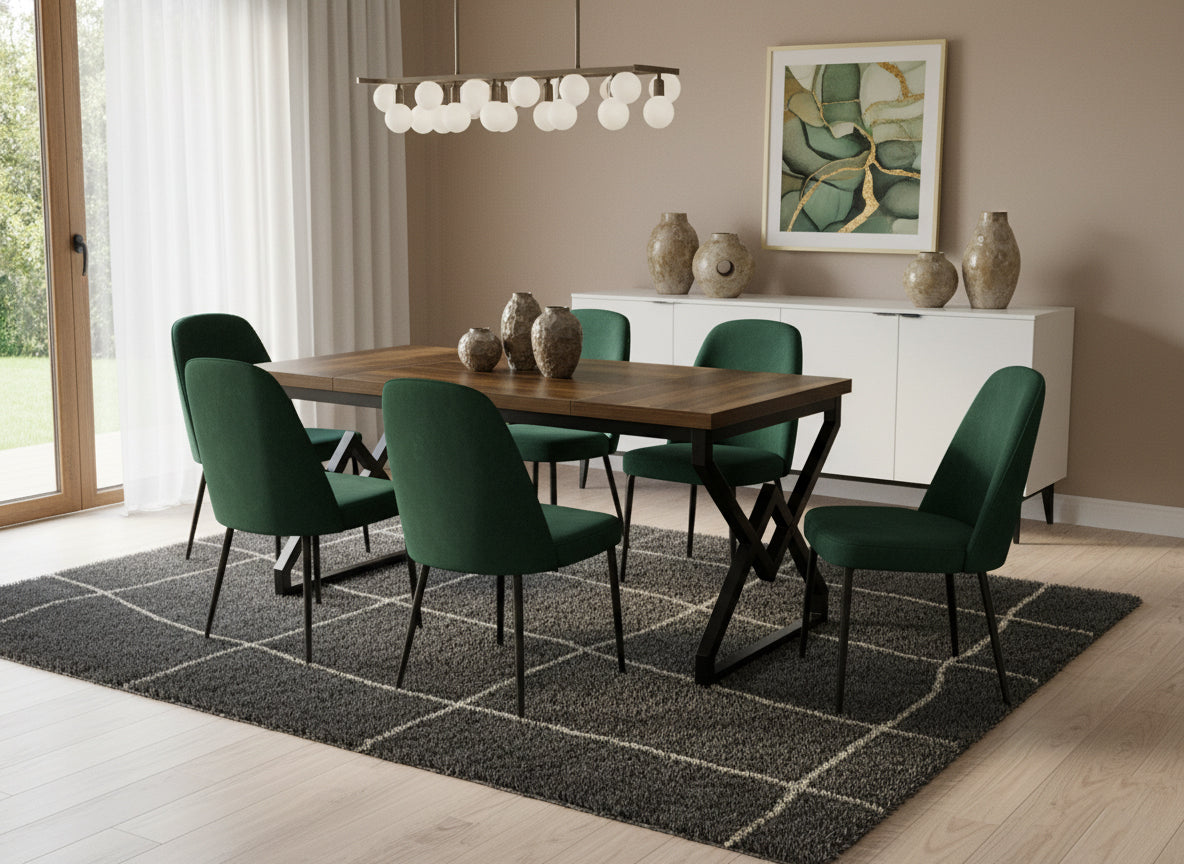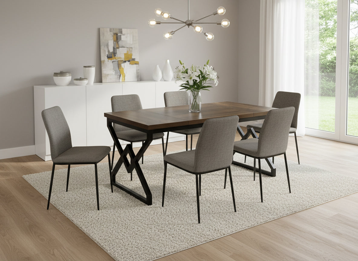 Vigyen merész, indusztriális stílust otthonába a Dollcini Otthon legújabb étkezőasztalával! Ez a darab a nyers erőt és a modern dizájnt ötvözi: a gazdag, sötét fa hatású asztallap melegséget sugároz, míg a robusztus, geometrikus formájú fekete fém lábak egyértelműen a loft lakások hangulatát idézik.