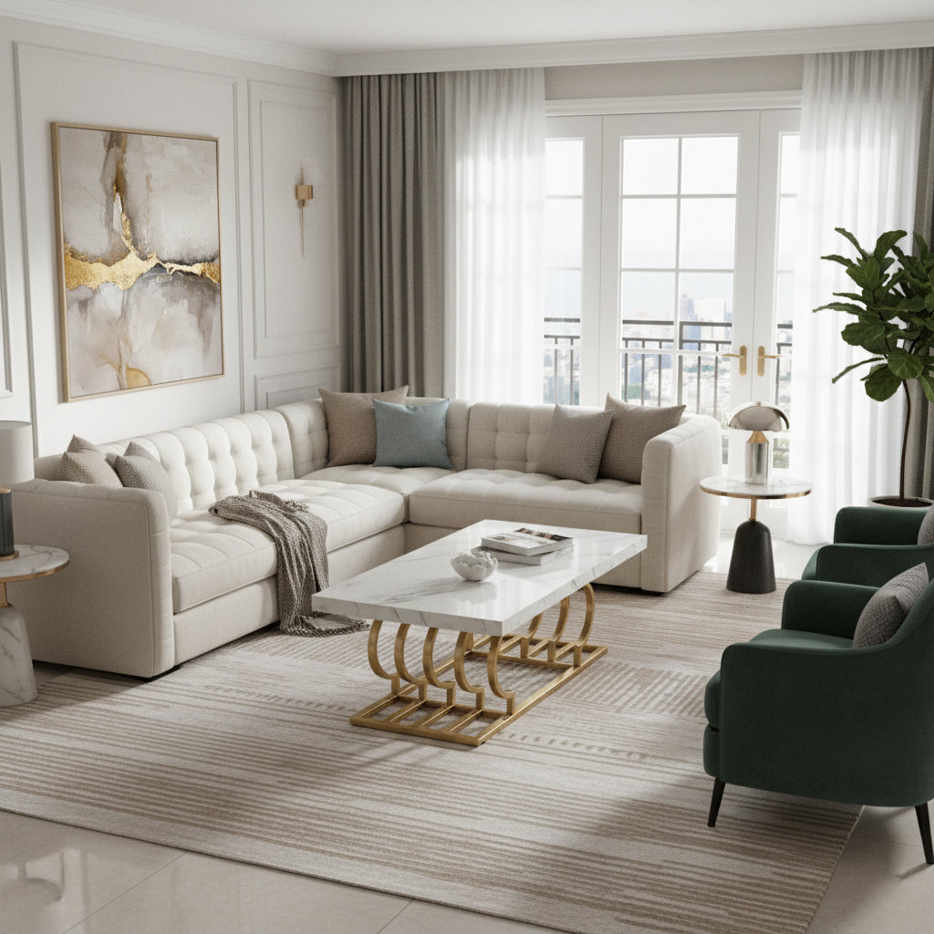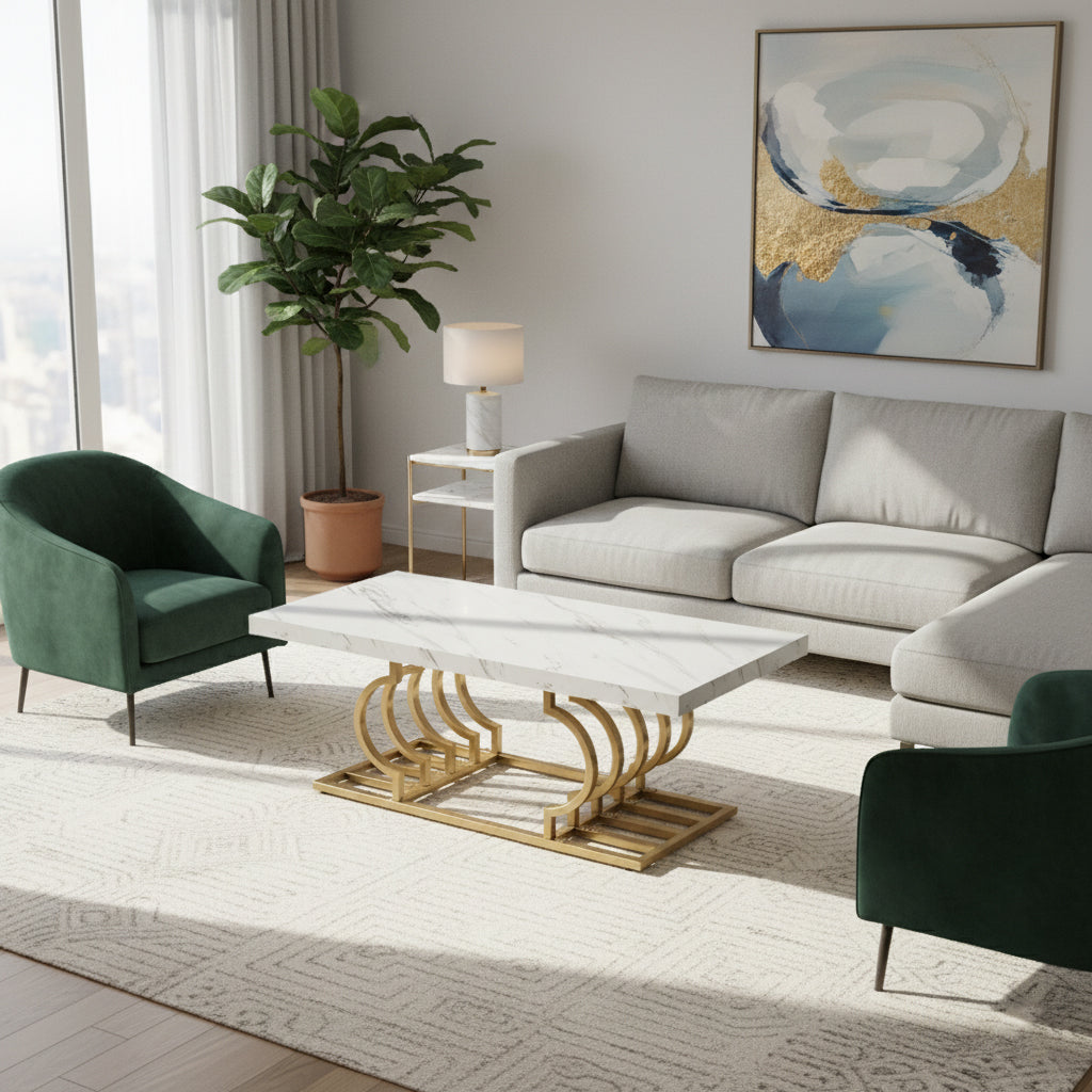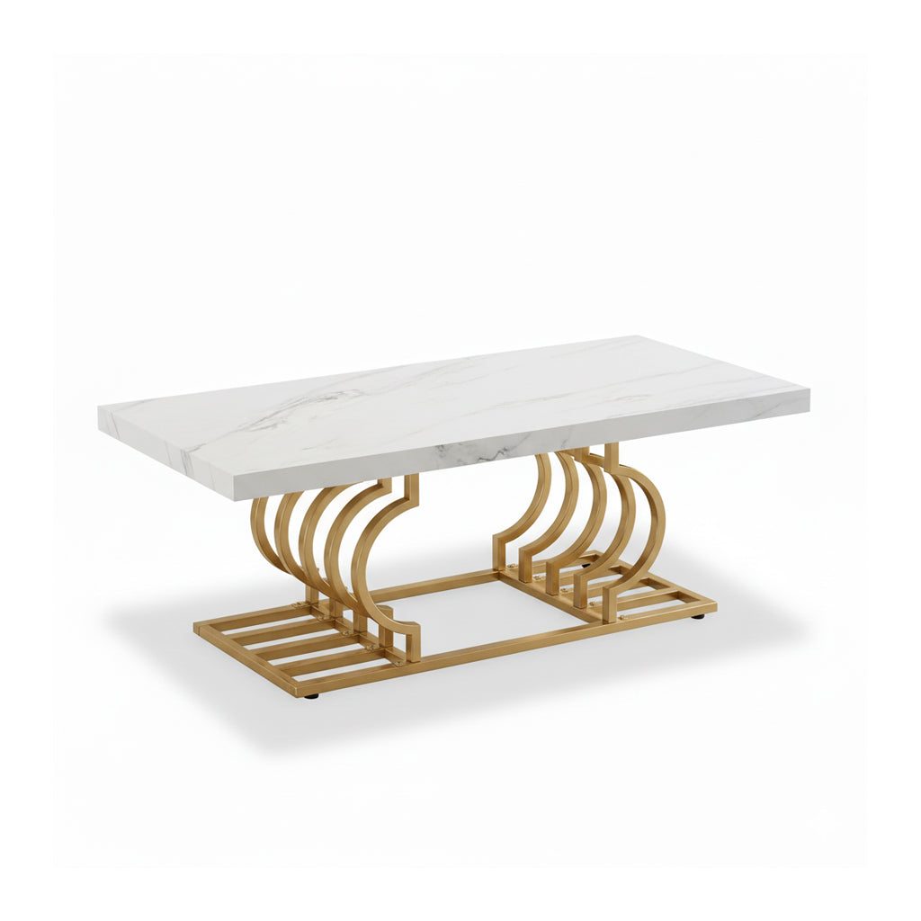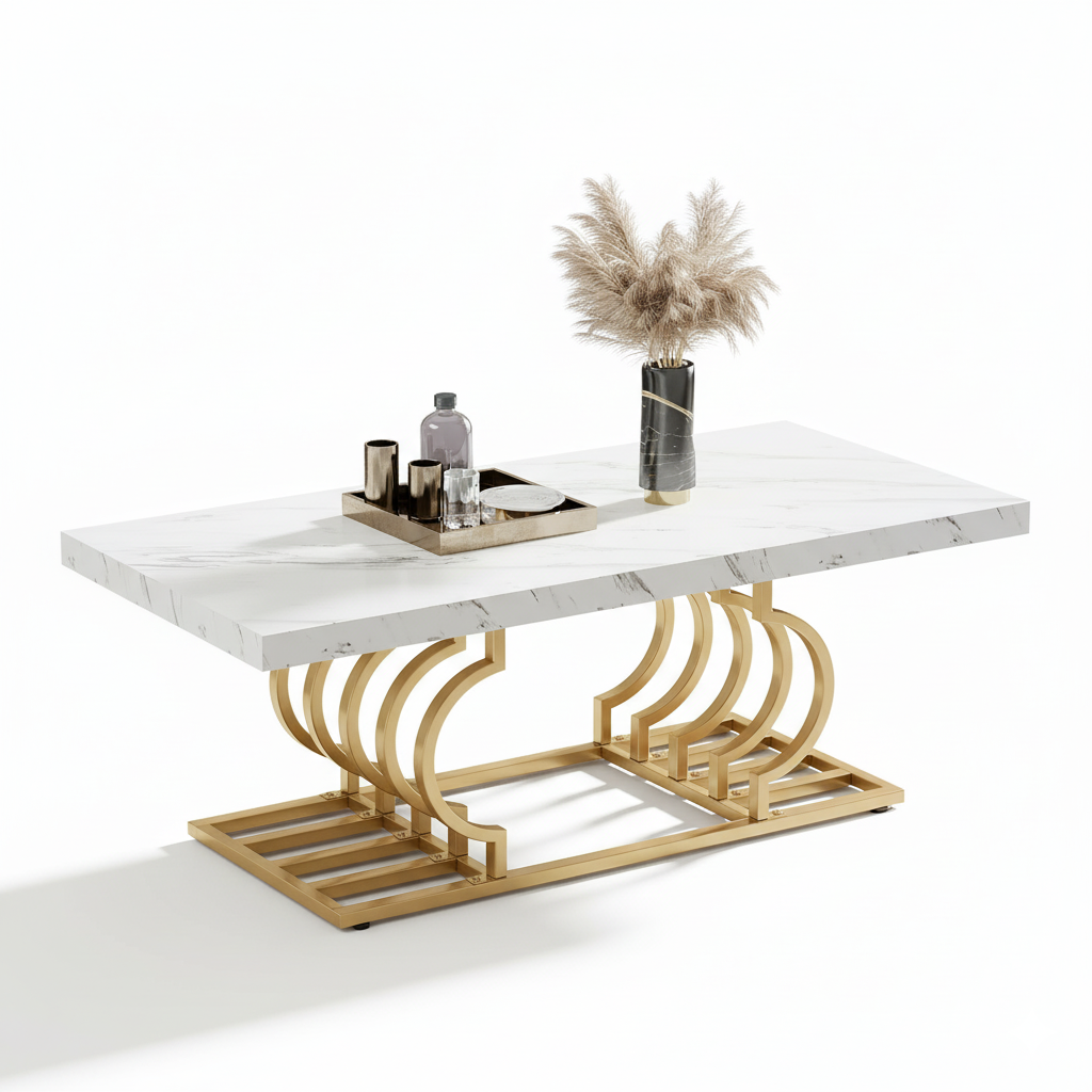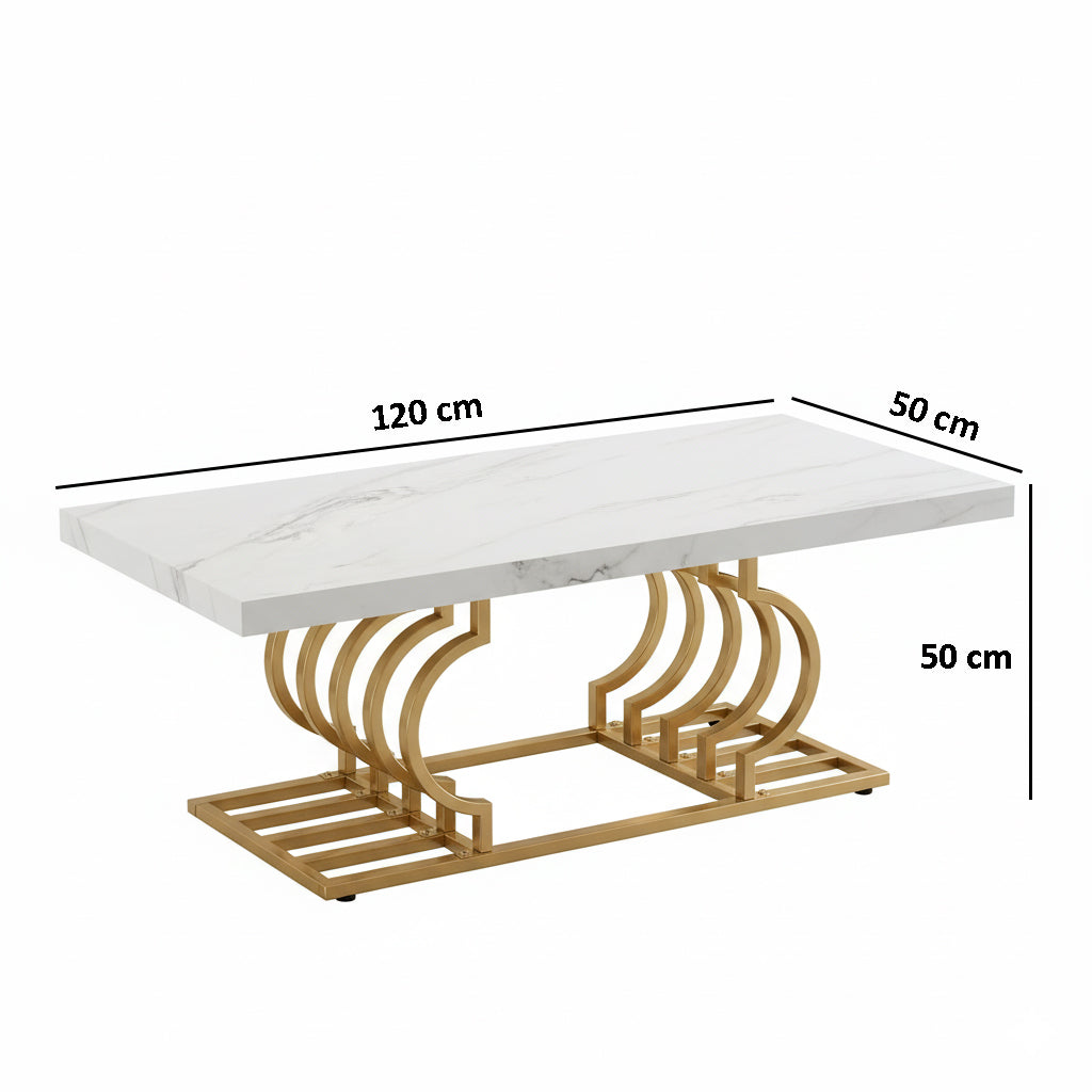 - Lenyűgöző Dizájn: A finom erezetű, fehér márvány hatású asztallap és a bonyolult, ívelt formákból álló arany lábazat párosa kifinomult és pazar megjelenést biztosít.