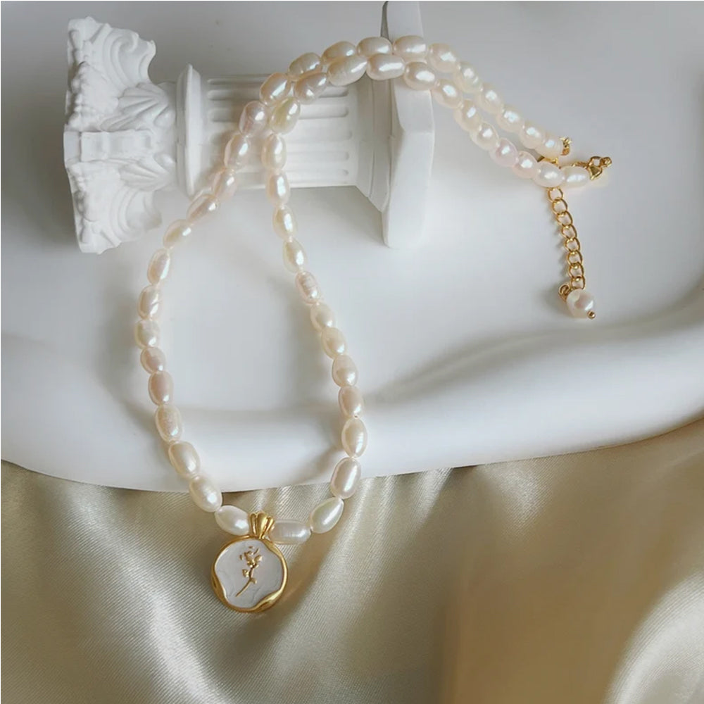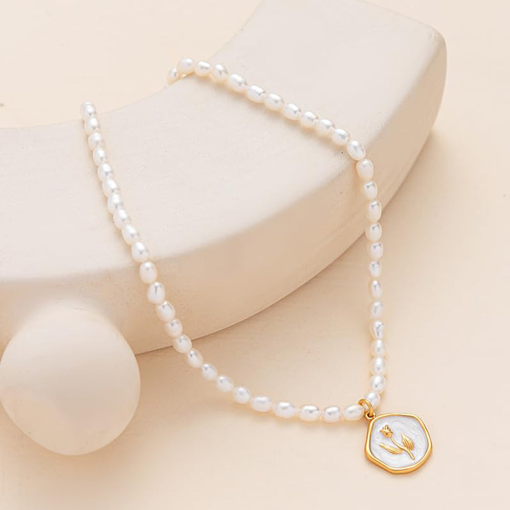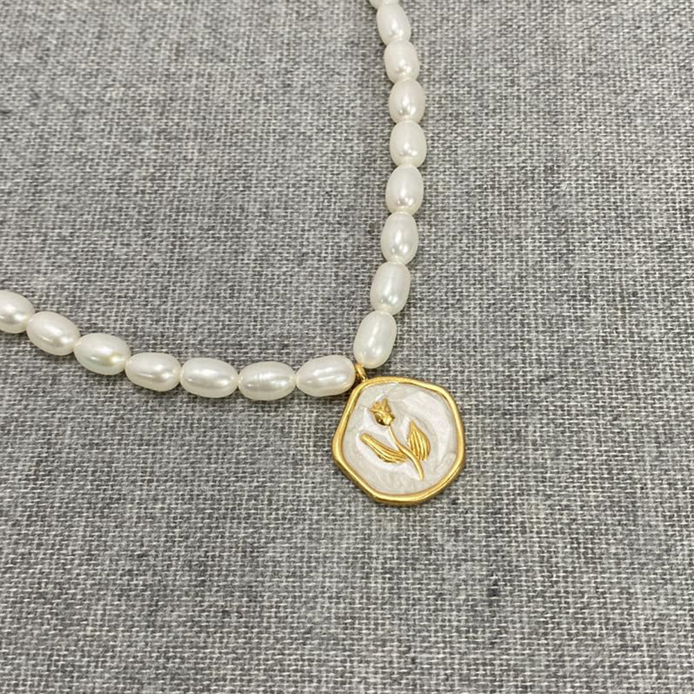 A francia romantika és a vintage nőiesség letisztult esszenciája. A lágy fényű gyöngysor finoman kiemeli a nyakat, a gyöngyházfényű, kézzel zománcozott virág medál pedig (rózsa vagy tulipán motívummal) azonnal különlegessé teszi a megjelenést.