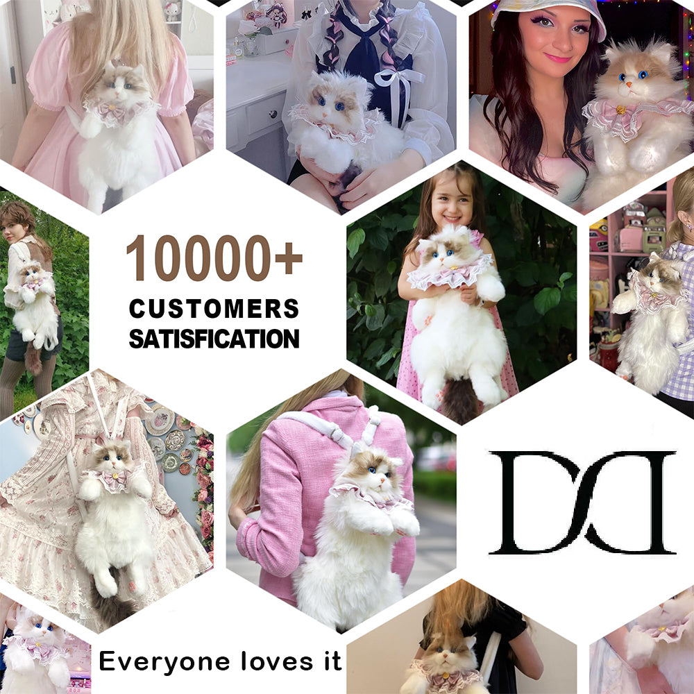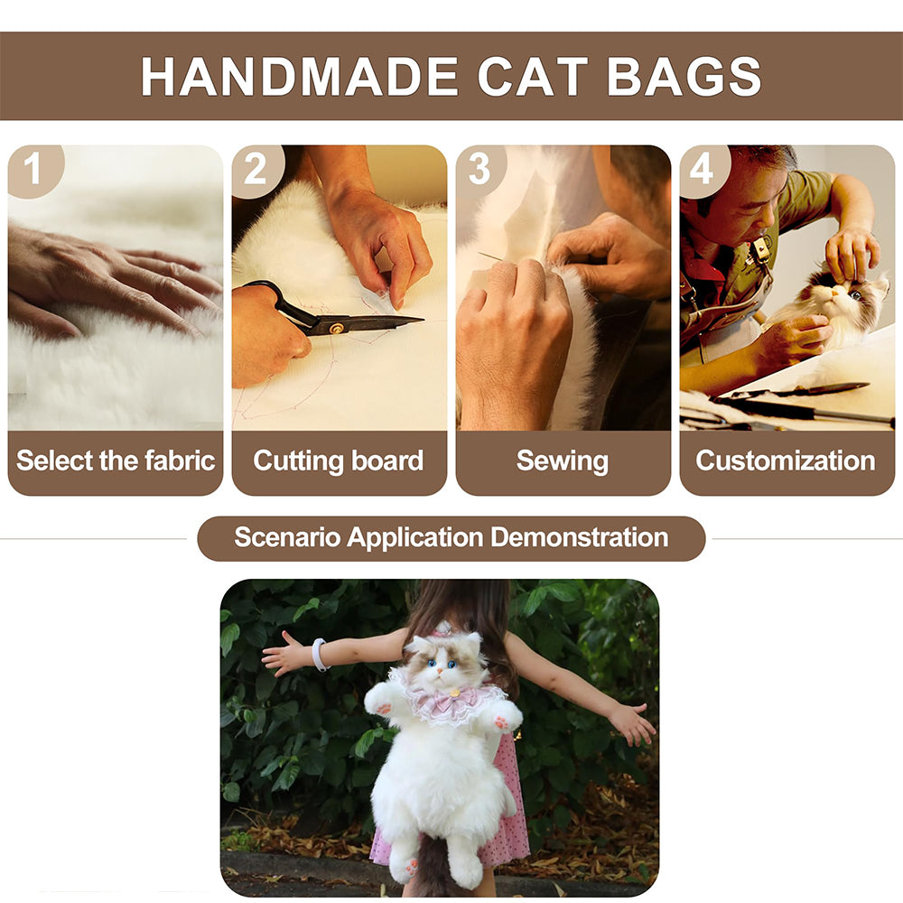 Realista dizájn: A táska megjelenése megtévesztésig hasonlít egy valódi macskára – 50 cm magas és 20 cm széles, prémium minőségű anyagokból készült, kézzel varrt részletekkel. A kék üveg szempár, részletes tappancsok és bolyhos farok igazi életszerűséget kölcsönöznek.