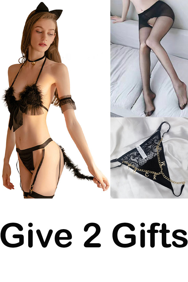 Az aranyos, mégis csábító macskafül-fejpánt és a hátoldalon lévő farok játékos erotikával tölti meg az összhatást – igazi karakterbe öltöztet.