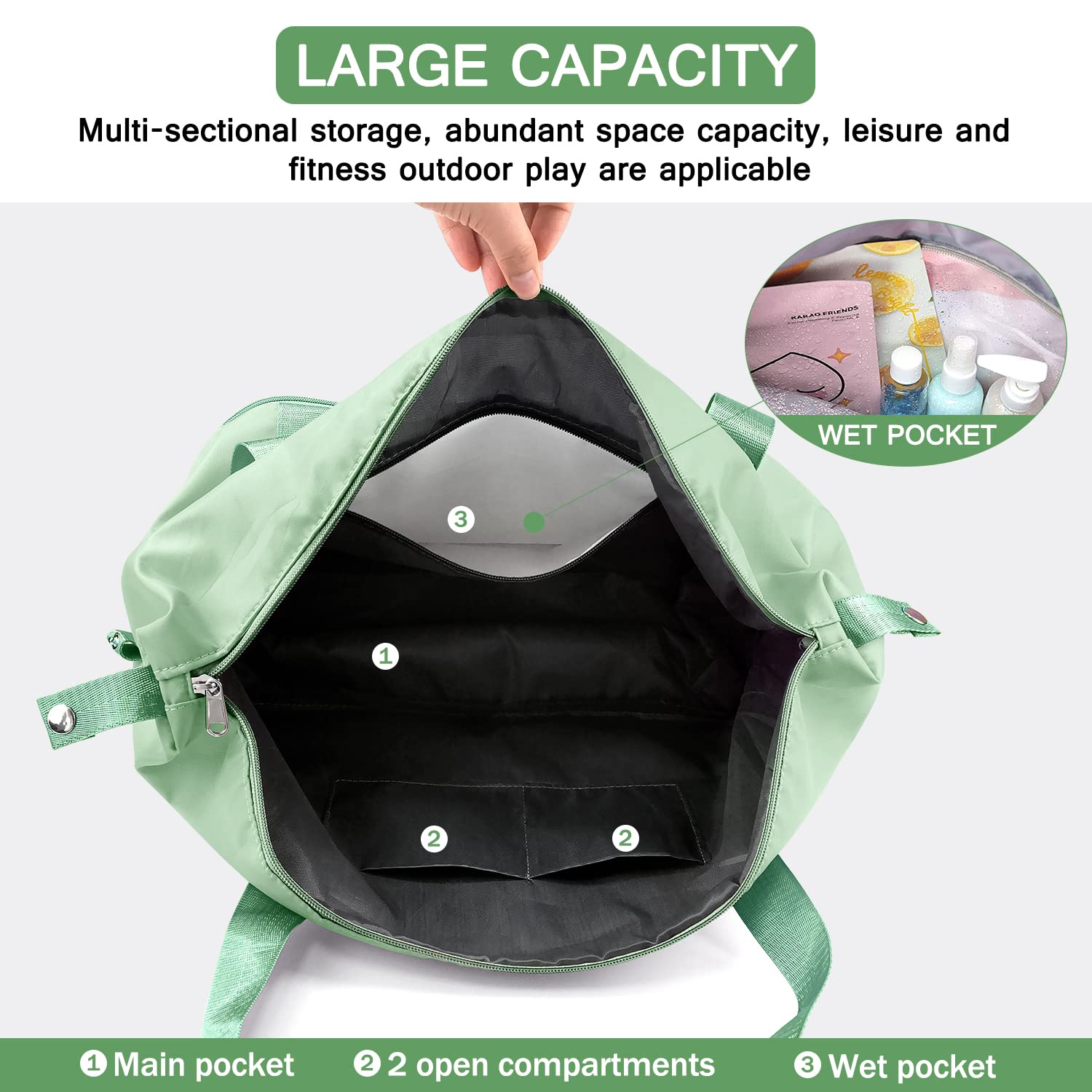 Külön nedves rekesz vizes ruhához, törölközőhöz vagy piperecikkekhez – rendezett, praktikus megoldás aktív napokra.